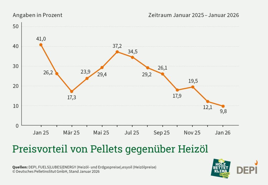 Im langfristigen Vergleich bleibt das Heizen mit Pellets weiterhin wirtschaftlich attraktiv. Gegenüber Erdgas beträgt der durchschnittliche Preisvorteil seit 2015 rund 30 Prozent, gegenüber Heizöl rund 25 Prozent.